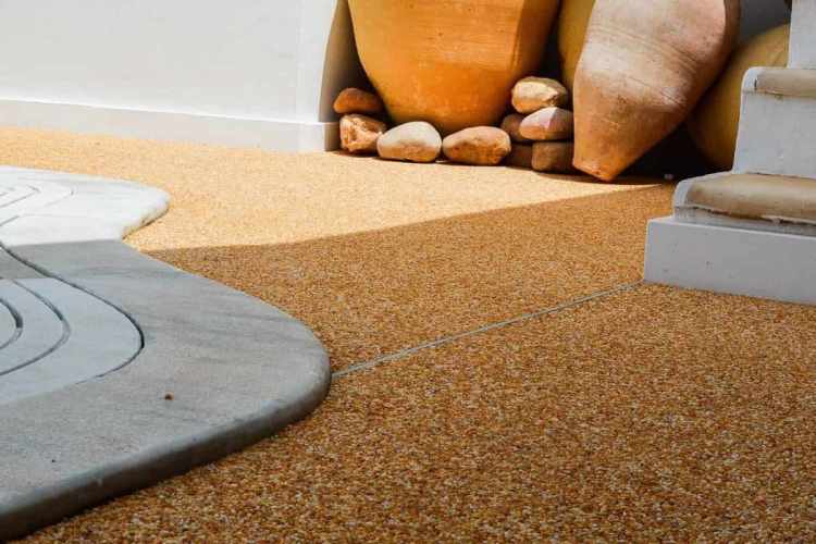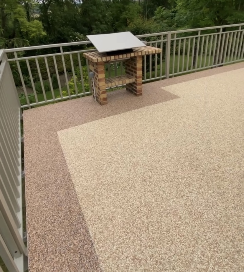 Un revêtement composé de granulats de marbres scellé par de la résine époxy.